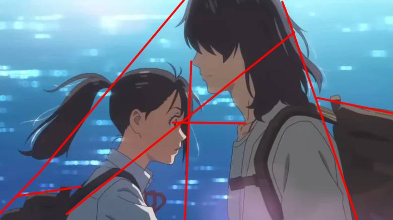 Let’s look at another example.The scene is a good example of the water lens effect. In this scene, Suzume passed behind Souta. Souta has his hair down, covering his eyes. Suzume’s equally long hair is up in a ponytail. The composition has a triangular design with Suzume’s angle moving toward Souta, foreshadowing how she moves toward him throughout the story. Their noses meet on the same plane. The angle of Suzume, including her backpack lends dynamism to the scene, against Souta’s less-forward moving motion. Her eyes align with his throat as she passes. Her eyes are uncovered, open to the future, while his are covered. He looks inward toward his problem as a Closer.