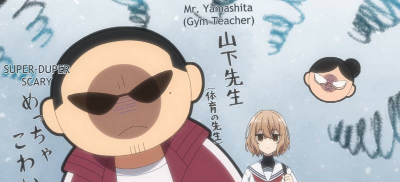 The story injects lighter-hearted scenes, particularly when Miko is involved, to balance the serious scenes. This contrast punctuates the psychological horror. Many horror stories make the mistaken of not introducing levity. Levity and rest periods of normalcy makes the horror elements more terrible through the contrast. From a visual standpoint, silly simplified “cards” like this one emphasizes the scenes lavished with frames, colors, and composition.