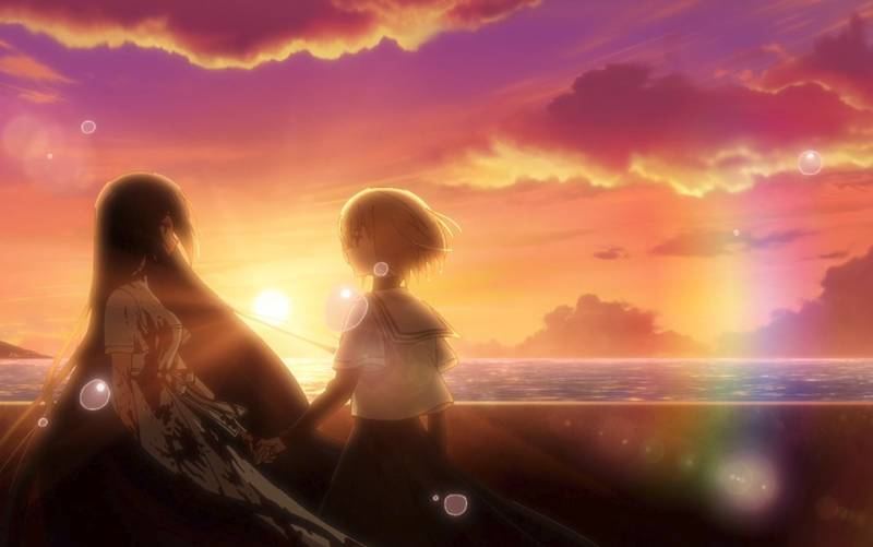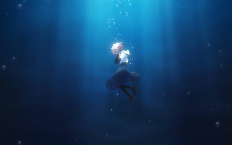 The story represents Hinako’s despair using undersea effects. Hinako feels as if a part of herself remains out at sea, with her family during the accident. She feels like she’s drowning in a dark sea, drifting alone. Miko’s over-the-top bubbliness sometimes offers a bit of light for Hinako to surface again, but Hinako never fully frees herself from her despair. It becomes a little easier after Shiori promises to kill and eat her, but Hinako rarely shakes her depression for long. She succeeds for short intervals after Shiori convinces her happiness would bring her closer to being eaten. Happiness and smiles are needed for Hinako to reach the height of her flavor, so to speak. It’s all a ruse to try to get Hinako to live, to be the little girl Shiori had met years before.