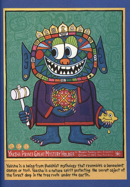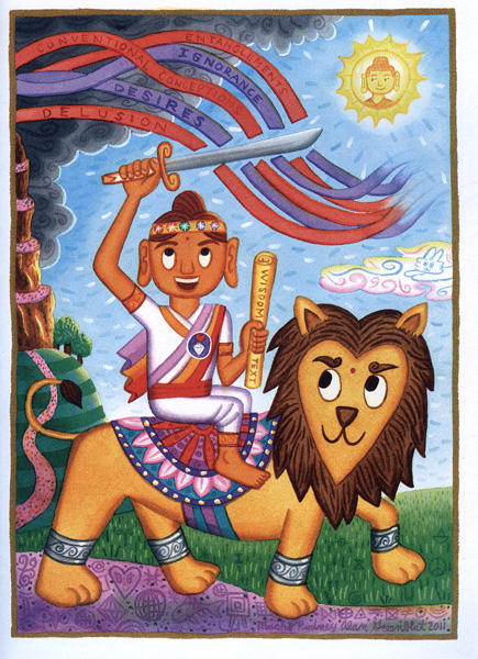 Dharma Delight reveals the key tenets of Buddhism with bright, vibrant illustrations. I received a review copy from Tuttle Publishing. The author’s illustrations leap from the page with cute monstrosities and humor. Each drawing contains layer of meaning. Unfortunately, Dharma Delight assumes you know Zen and Buddhist philosophy. Many of the illustrations contain multiple layers of meaning that may make the paintings appear strange if you don’t understand the symbolism. The author explains some of this symbolism, but the explanations are clearer if you have a Buddhist frame of reference. The painting style has strong Indian influences.