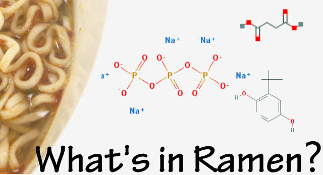 Have you ever wondered what goes into the otaku’s go-to food on the cheap? It’s also Naruto’s favorite food–ramen. The bowl of noodles and magic-flavor powder, like most packaged foods, is a wonder of engineering and chemical science. There is some actual food in it too. Some brands have slightly different formulas (you really can’t call them recipes), but these components are in most of them. I pulled this list from a package of chicken-flavored ramen in my cabinet.